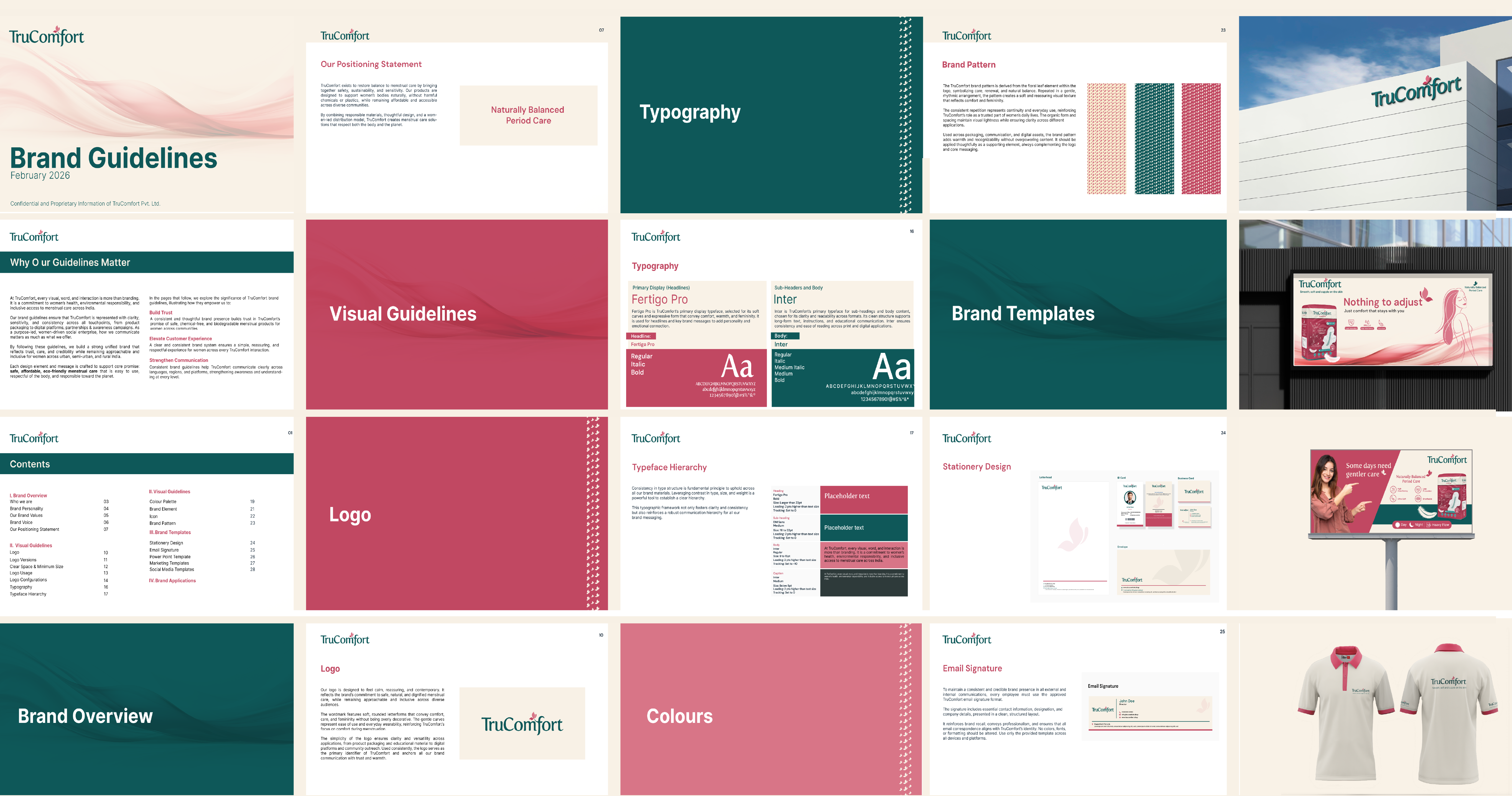 The branding exercise for TruComfort positions the brand as a progressive leader in menstrual wellness, combining elegance with a fresh and empowering visual language. Through a refined design system and a thoughtful color palette, the brand communicates comfort, trust, and a forward-thinking approach to women’s hygiene and sustainable care.